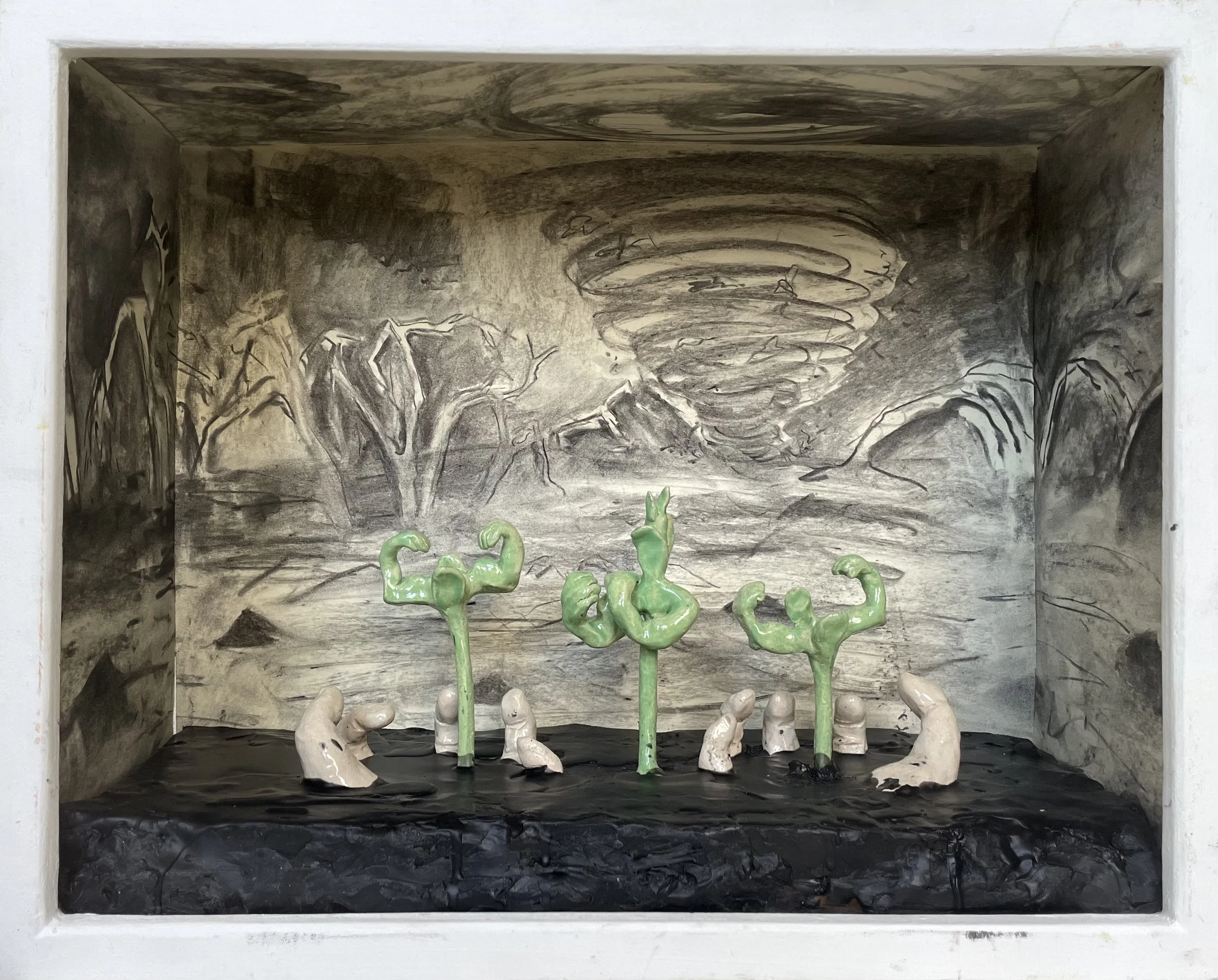 Die zwischen den Figuren hängenden Zweige stammen bewegen sich im Wind und berühren gelegentlich die Tonfiguren, sodass sie gleichsam miteinander im Gespräch sind.
